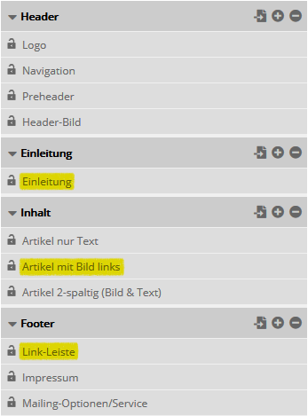 Auf der linken Seite sehen Sie die Inhaltselemente Ihres Mailings. Sie können jedes Element bearbeiten, löschen oder auch mehrfach einfügen. Welche Elemente zur Verfügung stehen, bestimmt die Programmierung des gewählten Templates.