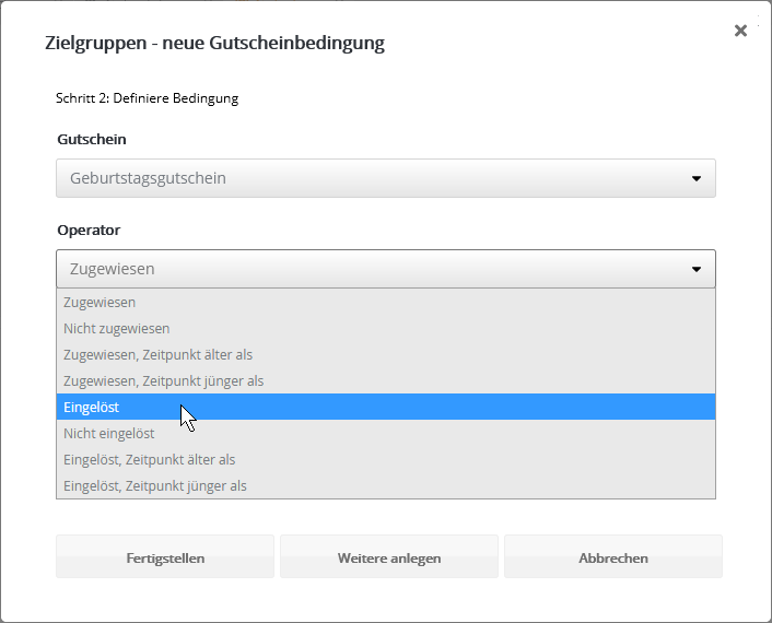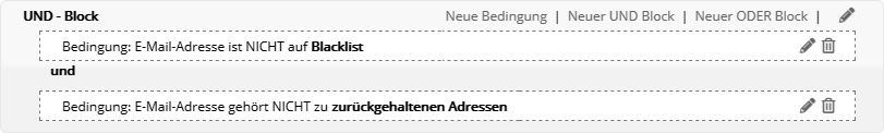Insbesondere nach dem Kopieren einer vorhandenen Zielgruppe kann das sinnvoll sein, wenn die identischen Abonnenten in Original und Kopie nicht gewünscht sind. Bedingung anhand GutscheinFiltern Sie Abonnenten danach, ob und in welchem Zeitraum die Zuweisung oder Einlösung eines Gutscheins stattfand. Tipp: Um zugewiesene Gutscheine als eingelöst zu markieren, nutzen Sie entweder die Webservice-Funktion 'RedeemVoucherByCode' oder importieren in der Gutscheinübersicht eine CSV-Datei mit den eingelösten Gutscheincodes. Bedingung anhand SelektionMit diesem Bedingungstyp nutzen Sie eine per Webservice angelegte Selektion von Abonnenten als bauchtreffer.ch-Zielgruppe. Der Bedingungstyp ist nur dann sichtbar, wenn per Webservice mindestens eine Selektion angelegt wurde. Das Besondere: In einer Selektion werden Abonnenten anhand einer Liste von IDs gruppiert. So lässt sich eine extern getroffene Abonnentenauswahl als Zielgruppe nutzen, ohne dass in den bauchtreffer.ch-Abonnentendaten ein gemeinsames Merkmal vorliegen muss. Die Details entnehmen Sie bitte der Webservice-Dokumentation, die wir Ihnen gern zusenden. Bedingung anhand des Empfängers (geplant)Diese Bedingung entscheidet, ob ein Abonnent als Empfänger eines bestimmten Mailings vorgesehen war oder nicht. Das bedeutet, dass er in einer Abonnentenliste bzw. Zielgruppe für ein bestimmtes Mailing steht, welches versandt wurde. Im Unterschied zur letztgenannten Bedingung wird der tatsächliche Empfang jedoch nicht geprüft. Es sind auch alle Empfänger enthalten, die das Mailing z. B. aufgrund von Bounces, Blacklists oder serversseitigen Spamfiltern nicht empfangen haben. Bedingung anhand des Empfangens (zugestellt)Diese Bedingung entscheidet, ob jemand ein bestimmtes Mailing empfangen hat oder nicht. Das Mailing gilt als empfangen, wenn der E-Mail-Server des Abonnenten eine positive Rückmeldung erteilt hat. Im Schritt nach dem Empfang ist es dennoch möglich, dass das Mailing beim Empfänger in einem Spamordner landet. Bedingung anhand des BounceverhaltensDamit legen Sie Bedingungen anhand der Zustellungen oder Nichtzustellungen eines bestimmten Mailings an. Bedingung anhand Blacklist bzw. Zurückgehaltener AdressenAbonnenten, deren E-Mail-Adresse auf einer Blacklist oder der Liste der zurückgehaltenen Adressen steht, werden automatisch vom Versand ausgeschlossen. Dieselben* Abonnenten lassen sich per Zielgruppe filtern, etwa um sie beim Export Ihrer Abonnentendaten ebenfalls auszuschließen. Die kombinierte Zielgruppe sieht wie folgt aus: