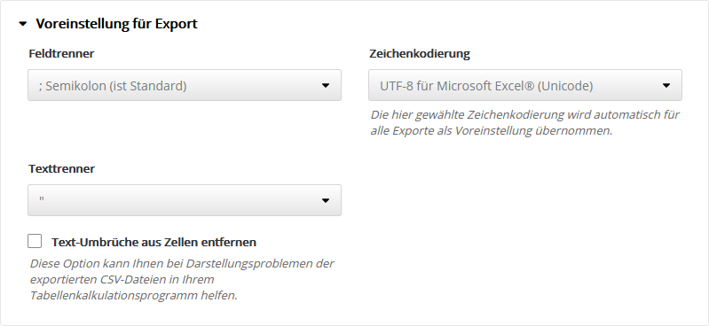 Folgende 'HTML-Editoren' sind in bauchtreffer.ch integriert und nutzbar: Grundeinstellung ExportHier legen Sie die Voreinstellung für den Export von CSV-Dateien fest, z. B. für den Export von Abonnentendaten. Bei der Durchführung jedes Exportes können Sie bei Bedarf auch eine abweichende Einstellung wählen. Standardeinstellung ist die Option 'UTF-8 für Microsoft Excel® (Unicode)', technisch gesprochen 'UTF-8 mit BOM'. Dieses Format wird von den meisten Officeanwendungen automatisch erkannt, so dass Umlaute und Sonderzeichen ohne manuelle Formatwahl korrekt importiert werden. StatistikeinstellungenTragen Sie Ihre eigenen Maximalwerte ein, um die rot|gelb|grün Farb-Umschaltung der Statistik-Anzeige für Öffungsrate, Klickrate und Bouncerate an die typischen Werte Ihrer Mailings anzupassen. Nur Ihre besten Mailings sollten den grünen Bereich erreichen. Die Farb-Umschaltung erfolgt automatisch in Drittel-Stufen des eingetragenen Maximalwertes. Empfehlung: Notieren Sie aus der Statistik Ihrer bisherigen Mailings die Durchschnittswerte für Öffnungsrate, Klickrate und Bounces. Damit dieser Durchschnittswert zukünftig im mittleren Drittel der Skala landet, tragen Sie das Doppelte dieses Wertes als Maximum in das jeweilige Feld ein. Tragen Sie z. B. 30% als Maximum ein, dann werden anschließend die Werte bis 10% rot, bis 20% gelb und darüberliegende Werte grün gefärbt. Sie sehen sofort, ob Ihr aktuelles Mailing über- oder unterdurchschnittlich abschneidet. Typische Durchschnittswerte: