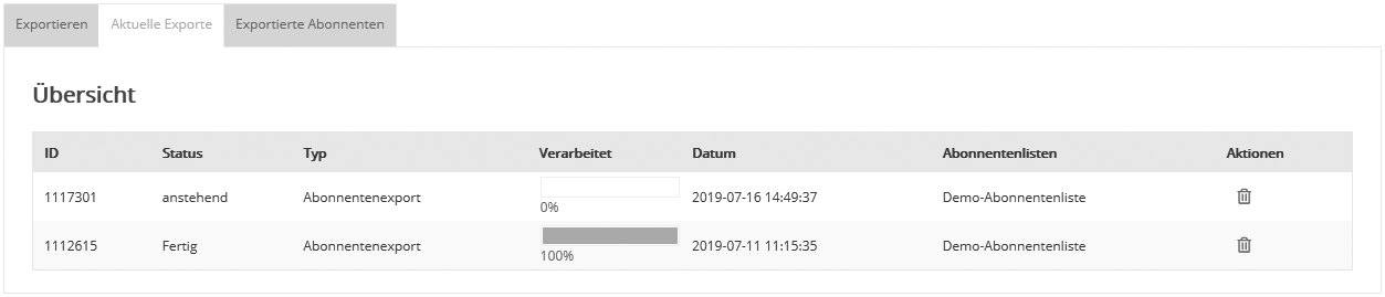 Im Reiter 'Exportierte Abonnenten' erfolgt eine Detailansicht über die exportierten Datensätze. Zum Download der Export-Datei klicken Sie schließlich auf 'Download'.