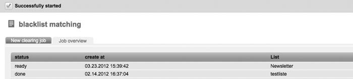 | You will find information on the blacklist and its function in 2.11 Blacklist. Via the function 'Blacklist matching', you can coordinate the data records of your subscriber lists with the entries in your blacklist. Detected subscribers will automatically be deleted by bauchtreffer.ch. First, you have got to choose the subscriber list which has to be examined. By clicking the 'OK' button, you will confirm the appearing message to delete the search results. The result will show you how many subscribers were removed due to the fact that they are registered in the blacklist. |