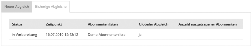 Daraufhin startet bauchtreffer.ch den Abgleich. Im Reiter 'bisherige Abgleiche' können Sie den Status des Fortschrittes einsehen. Nach Fertigstellung wird Ihnen die Anzahl der ausgetragenen Abonnenten angezeigt. |