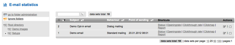 Here you find the statistics of all sent mails. For easier access bauchtreffer.ch already includes a demo-mail you can view. |