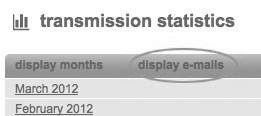 In the transmission- statistic you see the data collected from bauchtreffer.ch (Traffic, Total). Also you see, if exist, the numbers of test-sendings, clicks on the subsriber-link and the number of subscribers who have completed the optin-confirmation. Next to the view 'display months' you also can select 'display e-mails'. So bauchtreffer.ch outputs the above mentioned figures for each mailing.