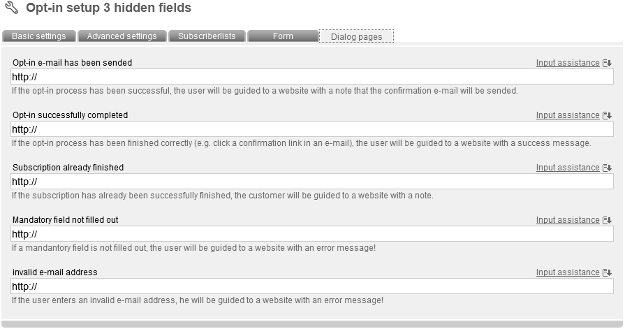 Now enter a name and an optional description for your optin setup. Then choose the 'mode' (important). The following modes are supported by 'bauchtreffer.ch': Double Opt-in with confirmation e-mail (recommended as the only legally secure login variant): Interested party visits a website with an optin setup form. He enters his data into the form. He gots an e-mail with content like this: „Thank you for your optin. Please confirm the registration confirmation link to complete your registration.“ He clicks the link. Registration is completed. He gots a „welcoming“ e-mail. You can integrate information about your company and a certain design as well. Double Opt-in: Like described before, but without sending of a „welcoming“ e-mail. Confirmed Opt-In: Nach Anmeldung auf der Webseite wird sofort eine automatische Begrüßungsnachricht versendet. Single Opt-in: No e-mails will be send. There just will be a message in your browser, that registration was successfull. According to the mode you've choosed, you have to adapt different sub-options. In Tab 'advanced settings' you can deposit your e-mail address in field 'e-mail forwarding', to be informed about new subscribers. In field 'mailing for later delivery' you can determine your last sended newsletter. All new subscribers will receive your last mailing and don't have to wait for another one. To protect your optin-form against abuse, activate the invisible captcha . Captchas are often used to check if petitions are produced by a machine (robot, short: bot) or a real person. Bots are often used abusive to generate masses of subscriptions. Choose your favorite subscriberfields, which should be filled in in next tab 'Form'. After clicking 'Add subscriberfield' a pop up appears, where you can select and add subscriberfields to your optin-form. Furthermore you can add one or more subscriberlists as option(s) in a ceckbox through the button 'add subscriberlist'. Click 'sort formfields' to edit order of your fields. Click 'test form' to check your form by a preview of your optin-form. Next tab: 'Dialog pages':