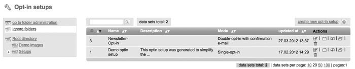 Through 'Setups' and 'Optin Setup' you can create forms, which can be included into your website. So interested parties can login automatically on your website for your subscriberlist(s). Please note: Requirement for a successfull 'optin setup' is to create an e-mail with type 'dialog mailing' for registration confirmation and welcoming, which got the status 'activated'. Otherwise those mailings will be lacking in the shortlist of mailings which you can choose for your optin setup. For an esier start bauchtreffer.ch gots a „Demo optin setup“ for you. Created optin setups can be 'opend' afterwards for editing, 'moving' to another folder or 'deleting'. If you have moved an optin setup into another folder, click 'open folder' to get into. Create new Optin setup |