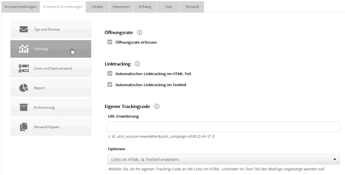 ÖffnungsrateUm nach dem Versand auszuwerten, wieviel Prozent der Empfänger das Mailing geöffnet haben (siehe 'Übersicht, Öffnungs-/Klickrate'), muss die Option 'Öffnungsrate erfassen' aktiviert sein. Dazu integriert bauchtreffer.ch im HTML-Teil des Mailings ein unsichtbares Zählpixel, welches für jeden Empfänger individuell verlinkt ist und dessen Aufruf als Öffnung gezählt wird. Die Messung funktioniert unabhängig von der Mailing-Einstellung 'Inboundimages', solange der Empfänger die Anzeige von Bildern in seinem Posteingang nicht unterdrückt. Hinweis: Ist die Erfassung der Öffnungsrate deaktiviert, aber die nachfolgende Option "Linktracking" aktiviert, dann werden Klicks automatisch auch als Öffnung gewertet. Die Öffnungsrate erfasst in dem Fall nur den Teil der Öffner, der irgendeinen Link angeklickt hat. LinktrackingAktivieren Sie Automatisches Linktracking im HTML-Teil, so wird jeder im Mailing enthaltene Link durch einen Tracking-Link ersetzt, der für jeden Abonnenten individualisiert ist. Diese Tracking-Links werden über den bauchtreffer.ch-Server auf die ursprüngliche Link-URL umgeleitet und dabei gezählt. Damit können Sie nach Versand des Mailings sehen, wie oft jeder Link angeklickt wurde (siehe 'Übersicht, Öffnungs-/Klickrate'). Weiterhin lassen sich darauf basierend Zielgruppen bilden, z. B. "Alle, die Link B angeklickt haben" können erneut mit weiteren Informationen angeschrieben werden. Bitte beachten Sie, dass Sie jede URL vorher als Link definieren müssen. Sie können die Richtigkeit der Tracking-Links überprüfen, indem Sie sich ein Testmailing zusenden. Eigener Tracking-CodeHier ist es möglich, alle Links des Mailings automatisch um eigene Parameter zu erweitern. Damit lässt sich das weitere Verhalten der Newsletterempfänger per Website-Analyse-Tools wie z.B. Google Analytics, Piwik oder econda tracken. Kopieren Sie dazu den Tracking Code Ihres Tools in das Feld, damit bauchtreffer.ch ihn automatisch an alle externen Links Ihres Mailings anhängt. Folgende Parameter werden unterstützt: