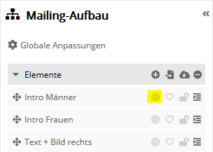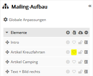 Die Symbole zum Bearbeiten eines Elementes (Artikels) sind im Mailing-Entwurf und Elementbaum identisch: