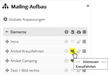 Aus diesem Pool bedienen Sie sich, um neue Elemente in Ihr Mailing einzufügen. Ziehen Sie das gewünschte Element per Drag&Drop auf einen der grau markierten Bereiche im Mailing-Entwurf.
