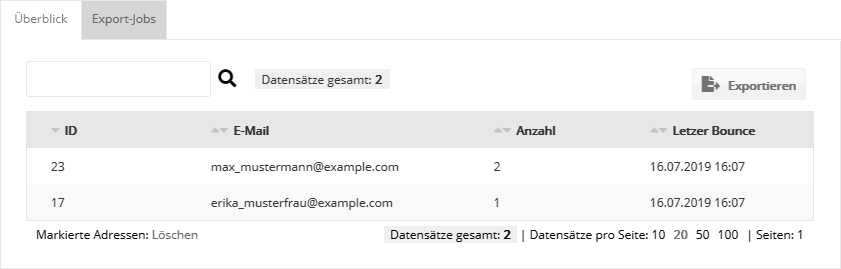 Reiter 'Überblick'Hier werden alle E-Mail-Adressen aufgelistet, deren Versendungen aufgrund von drei aufeinanderfolgenden Hardbounces zurückgehalten werden. Diese Adressen werden auf der bauchtreffer.ch-internen 'Retained List' gesammelt. Verwaltet werden hier ausschließlich die reinen E-Mail-Adressen, unabhängig von den dazugehörenden (eventuell ehemaligen) Abonnenten. Oben rechts können Sie mit Klick auf den 'Exportieren'-Button die zurückgehaltenen E-Mail-Adressen als CSV-Datei exportieren. Die erzeugte CSV-Datei lässt sich anschließend auf dem Reiter 'Export-Jobs' herunterladen.